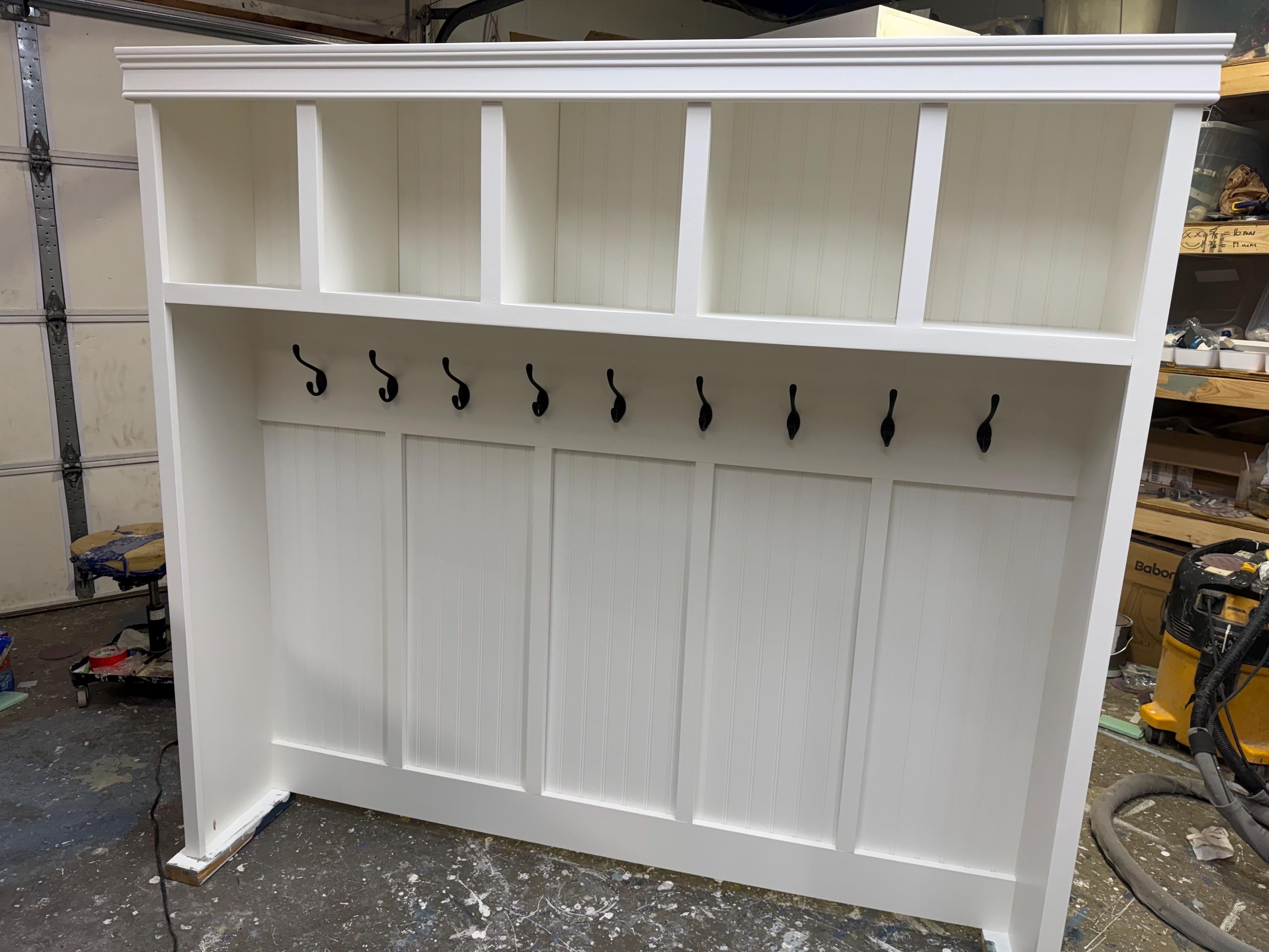 The 505 Style has, 5 upper compartments on the top shelf, open middle hanging section and 5 Divisions below the bench, either open or for baskets.